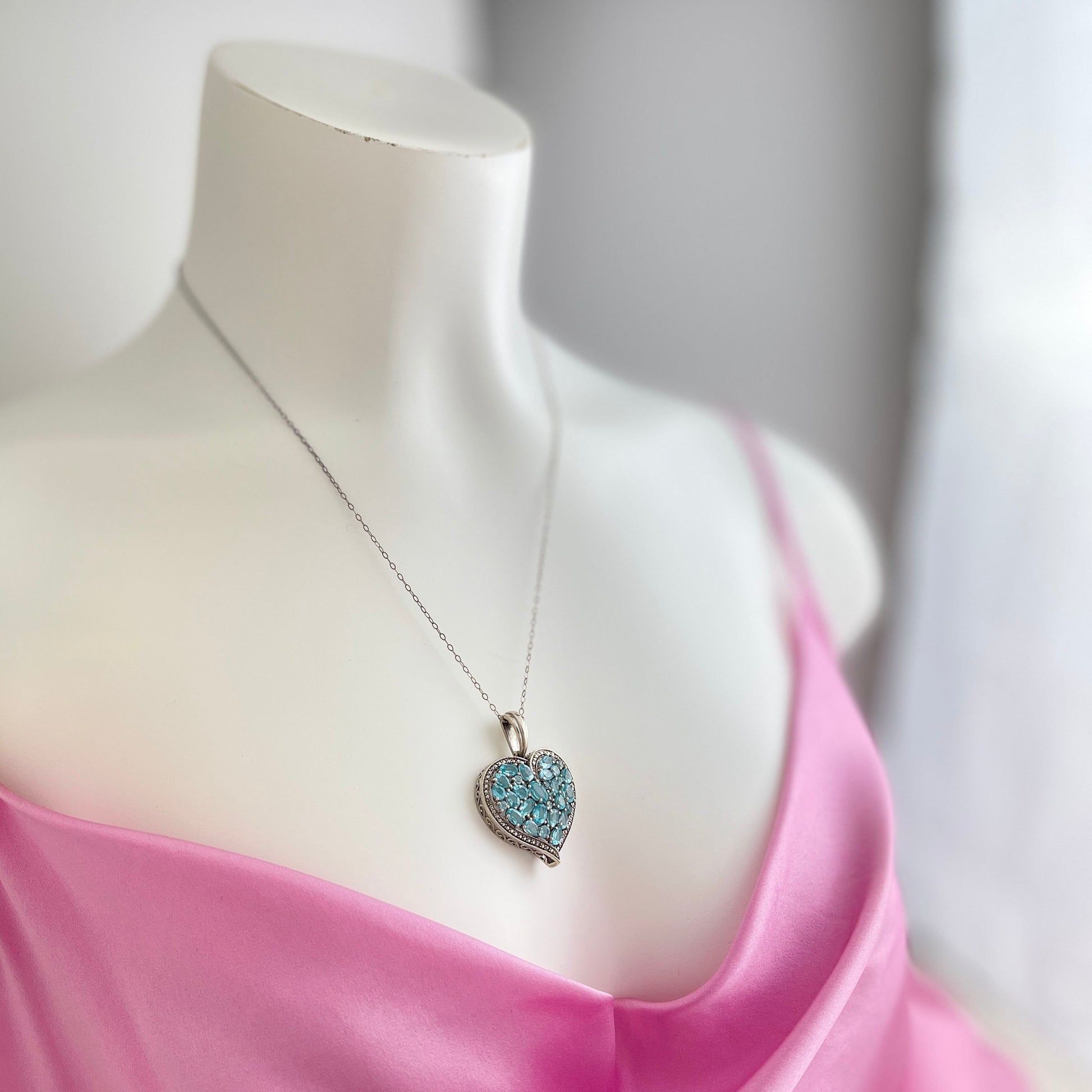 Nearly 6 carats of oval, pear and round-cut Paraiba apatites adorn this heart pendant. A delicate, 20-inch cable link sterling chain is included. The pendant itself measures 1.5"L x 1 1/8"W. Total weight = 8.5 grams. Pre-owned, excellent condition